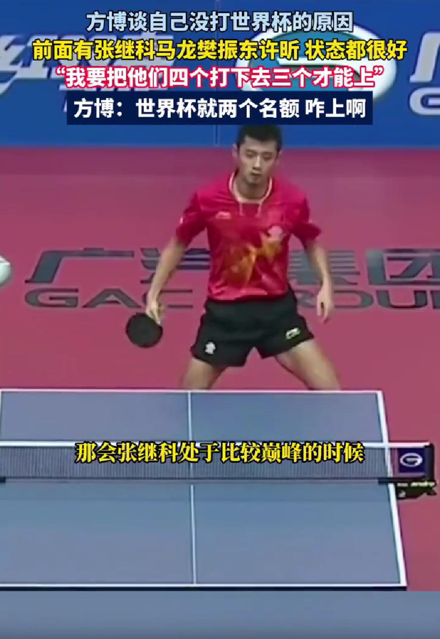 随后,方博一脸无奈地解释道:“我给你讲一讲啊,在我那个年代,我前面的4个人,当时前面有张继科、马龙、樊振东、许昕四大高手,那时候张继科属于比较巅峰的时候,马龙刚到巅峰,樊振东刚杀出来,还有一个许昕状态也不错。都是奥运会周期嘛,他们全在巅峰期,世界杯都在争,每一个世界杯名额都争夺,就两个名额,我得把他们四个打下三个才能上,你说咋上啊?我上不去,世锦赛我能卡在第5个,我能打一下。”
